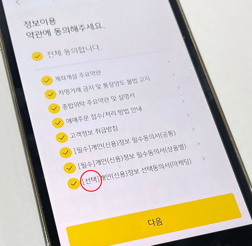 다음은 약관 동의를 해주시면 되는데요. 모두 필수 항목이나 맨 하단에 선택 부분에 마케팅 동의이니, 굳이 나는 마케팅 홍보물을 받을 필요가 없다 하시는 분들은 선택 해제를 해주시고 다음을 진행해주시면 되겠습니다. 저희 부모님은 해제시켜드렸습니다.
