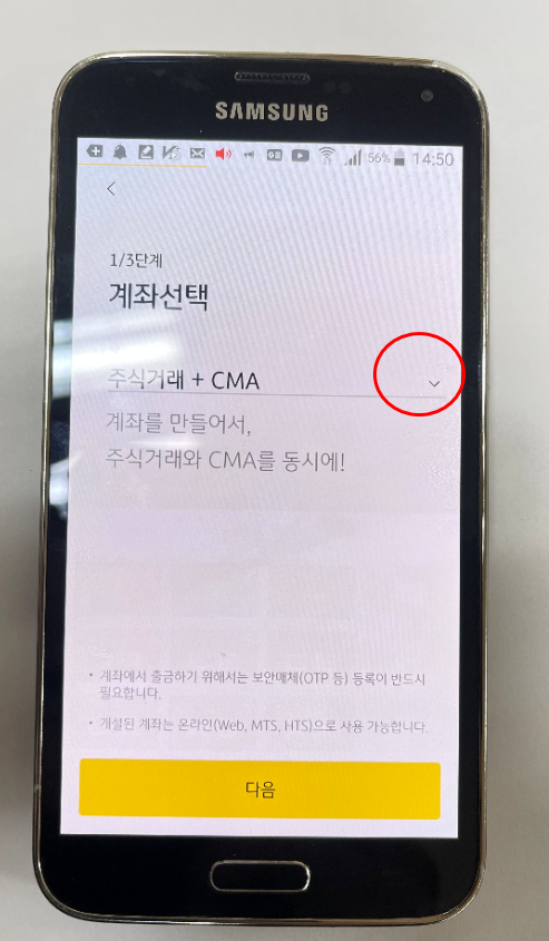 시작 버튼을 누르시면 다음과 같은 화면이 나오게 되어있습니다. 여기서 여러분이 개설하실 계좌의 종류를 선택해주시면 되는데요. 우리는 CMA 통장까지는 필요 없으니, 사진에 제가 동그라미 버튼을 친 부분을 클릭해서 주식거래 계좌로만 통장을 개설하겠습니다.