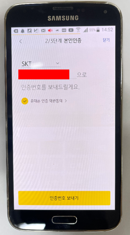 사용하고 계신 통신사와 핸드폰 번호를 입력하시고, 약관을 읽으신 후 동의를 눌러주세요. 그다음 사진과 같이 인증번호 보내기 버튼을 누르시면 KB증권에서 인증번호 4자리를 보낼 것입니다. 메시지로 도착한 인증번호를 입력하시고, 다음 진행 버튼을 눌러주세요. 이렇게 하면 본인 인증 3가지 중 하나를 마치신 겁니다.
