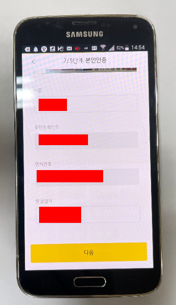 촬영을 하시면, 다음과 같이 프로그램이 여러분이 촬영한 신분증의 내용을 자동적으로 기입하게 됩니다. 하지만 KB증권이 못하는 것이 아니라 아직 우리 기술의 부족하기 때문에 인식률이 그렇게 높지는 않습니다. 한 번에 정확하게 기입이 될 수 있지만 그렇지 않은 경우도 있기 때문에 반드시 정확히 정보가 입력되었는지 확인하시고 다음으로 넘어갑니다.