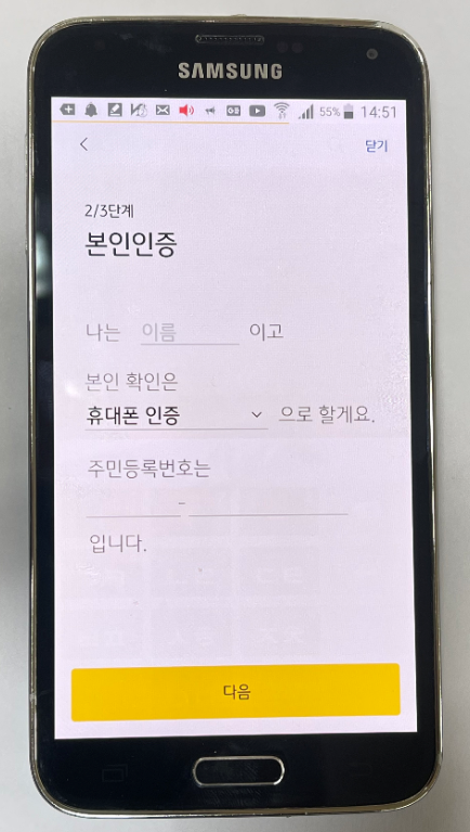 이름 부분에 이름을 적어주시고, 주민번호를 선택해주세요. 저희 부모님께서는 간편하게 휴대폰으로 인증을 진행했습니다. 정보를 다 입력하셨다면 다음 버튼을 눌러주시면 되겠습니다.