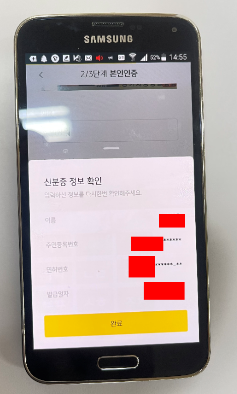 다음 버튼을 누르시면 KB증권도 정보가 잘 못 기입을 할 것을 대비해 한 번 더 확인하는 시간을 드리게 되어있습니다. 정보가 잘 못 들어갔는데도 계속 진행을 하게 되면 추후에 오류가 생겨 처음부터 시작해야 하는 불상사가 생길 수 있습니다. 따라서 정보를 다시 한번 잘 확인하신 후 완료 버튼을 눌러주세요. 이제 본인 인증 3가지 중 2번째를 완료하신 겁니다. 마지막 본인 인증은 이후에 진행됩니다.
