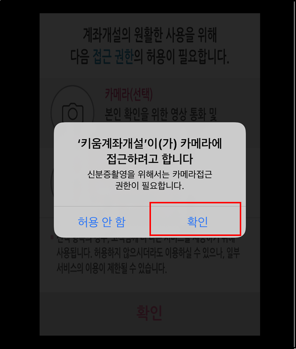 어플을 실행시키면, 바로 다음과 같이 "키움계좌개설이 카메라에 접근하려 합니다"라는 문구가 뜨게됩니다. 이는 여러분이 계좌개설을 위해 본인 신분증을 촬영해야하는데 이 과정 때문에 카메라 촬영 기능 사용을 어플이 요청하는 것입니다. 확인 버튼을 눌러주시면 되겠습니다. 여러분 정보를 뺏어가려는 것이 아니라, 단순히 핸드폰 카메라 기능을 사용해도 되냐 묻는 것이기 때문에 걱정하실 필요는 없습니다.