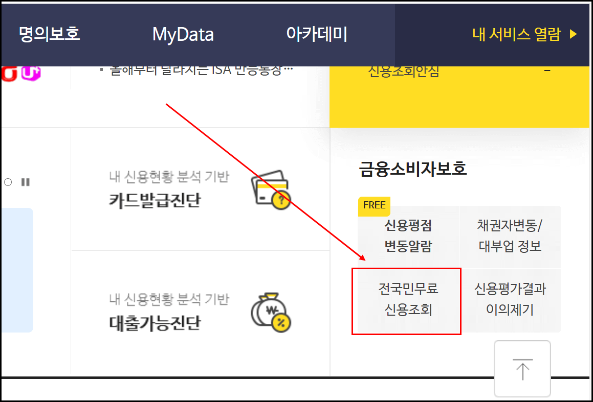 STEP 2: 전 국민 무료 신용조회 클릭 > 열람하기 선택