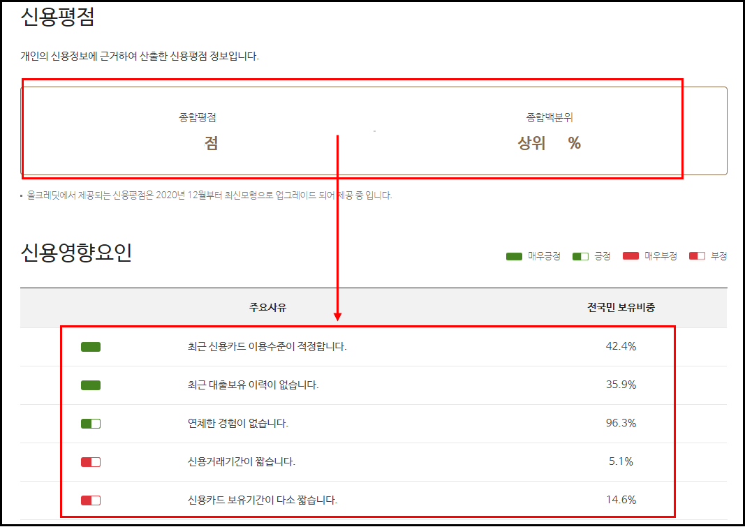 마지막 단계. 신용평점을 확인해주시면 되는데요. 스크롤을 조금 더 내리면 아래 본인의 점수가 왜 이렇게 정해진 것인지 세부적으로 평가하는 표가 있습니다. 이 표를 꼭 주목해야 합니다. 이 화면을 저장 또는 기록을 해두시는 것을 권장드립니다.